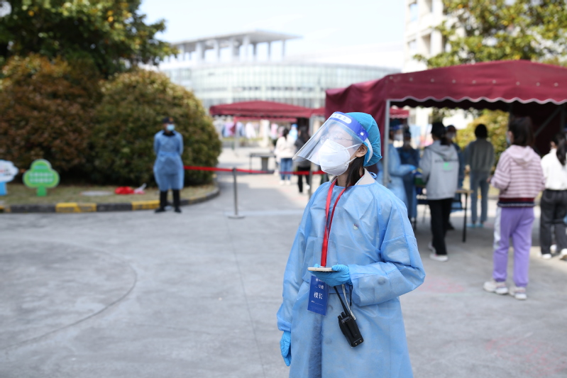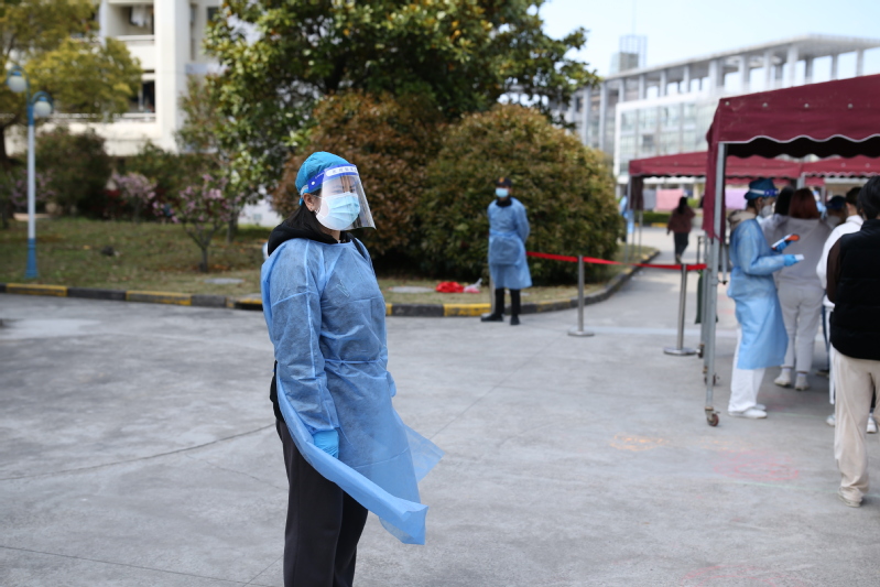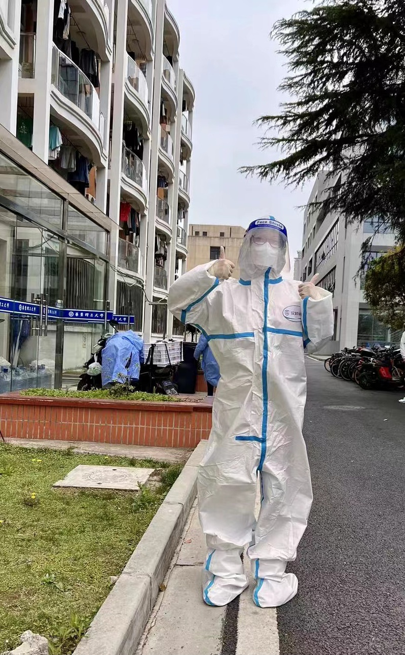 3月14日,这是张佳怡刚刚举办完婚礼后的第二周,她收拾行李离开家,进入了封控的徐汇校区。从此,校园里每一天都能看见她骑着单车往来的身影。大白、小蓝、校园骑手、数据排摸,每一个角色她都努力执行、用心做好,与学院师生齐心协力,做好疫情防控工作。此外,她还同时与奉贤校区的团学组织持续保持联系,做好各类线上线下的活动设计与组织。
