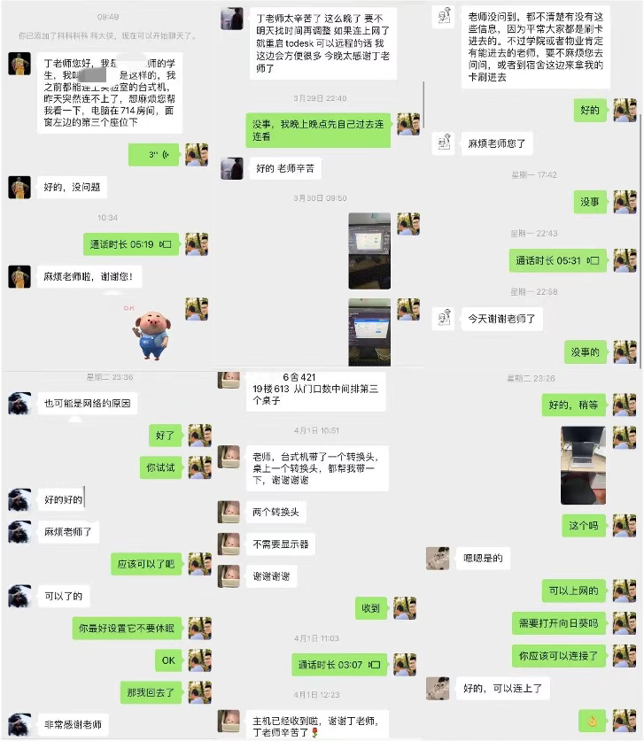 当前正值毕业季,部分学生课题需要随时调参和进行实验环境的设置,以保证实验能连续进行。正是因为丁炜超等老师的不辞辛劳、默默付出,确保了学生实验项目、论文的正常开展。一个月来,他先后帮助age动漫 100多名同学解决学习和生活困难:为学生运送电脑、显示器、书籍、硬盘等学习资料,帮学生服务器、电脑中安装远程软件,调试设备及网络,使学生可以在宿舍远程操作实验设备。