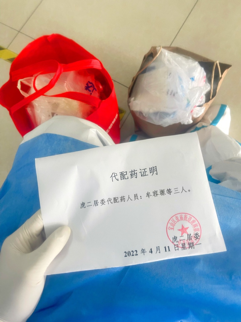 他前往医院为居民代配药,开启“跑腿小哥”配药之路,三大包医保卡、近五个小时,带着每一位居民的配药清单,为居民挂号、开药、付费、领药,并核对药品和计费单据,将所有居民的医保卡和药品运送回小区消毒、分发,尽心尽责守护居民健康。