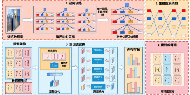 图片说明:基于自适应多教师蒸馏的神经网络搜索算法流程图